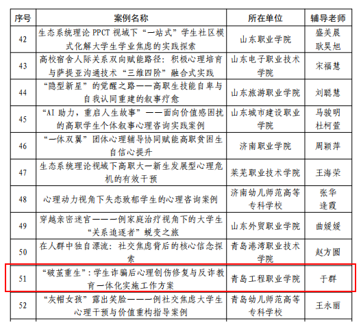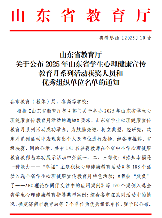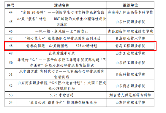 近日,青岛工程职业学院积极响应山东省教育厅号召,以2025年525心理健康月为契机,积极参加2025年山东省学生心理健康宣传教育月活动评选,按照活动要求,学院心理健康中心报送的心理健康月活动入选全省学生心理健康宣传教育月特色活动,心理健康教育案例入选全省学生心理健康教育指导典型案例。