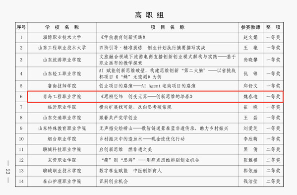 近日,第九届山东省黄炎培职业教育创新创业大赛落下帷幕。本次大赛以“职教育工匠,双创筑梦想”为主题,由山东省中华职教社、省总工会、省教育厅、省人力资源社会保障厅共同举办,是专门面向职业院校、技工院校师生的创新创业品牌赛事。自启动以来,共317所职业院校的1596个项目进入复赛,参赛单位覆盖面创历史新高。学院基础教研部魏春迪老师凭借《思辨经纬 创变无界——创新思维的培养》项目,在通过青岛市黄炎培创新创业大赛的选拔斩获教师组一等奖后,从众多优秀参赛作品中脱颖而出,成功斩获山东省高职教师组一等奖。